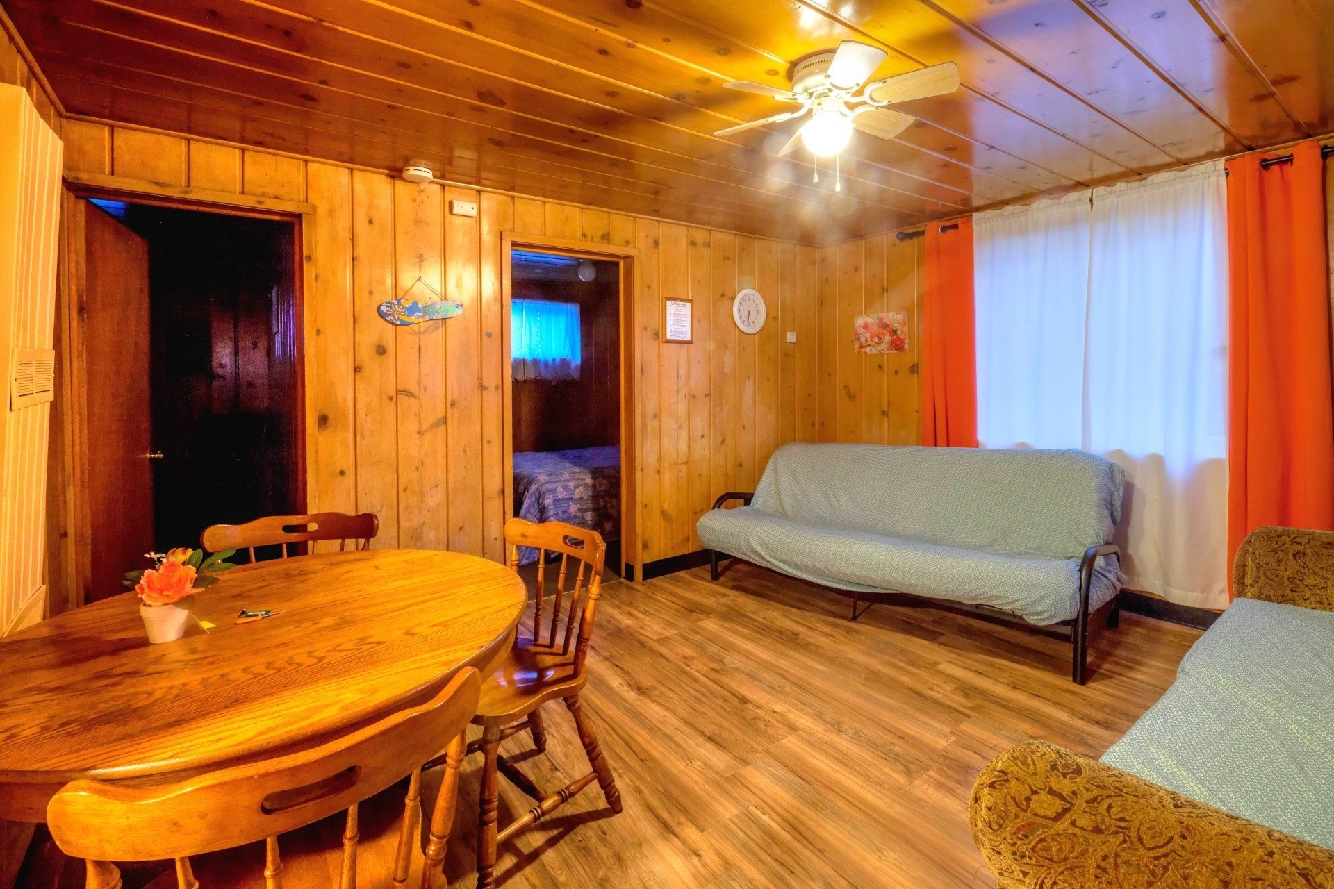 In each of our cabins, you will stay cozy with two separate bedrooms, a full-bathroom, kitchen, and living area. This includes a queen and full size mattress, plus a futon lounge for extra sleeping room. In the kitchen, you will find plenty of tableware and utensils, plus full-size appliances including a refrigerator, range, microwave, and a coffee-maker. Our cabins are perfect for up to 4 guests. Sleeps 6